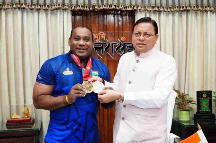 देहरादून मुख्यमंत्री पुष्कर सिंह धामी से शुक्रवार को मुख्यमंत्री कैम्प कार्यालय में वेटलिफ्टर मुकेश...