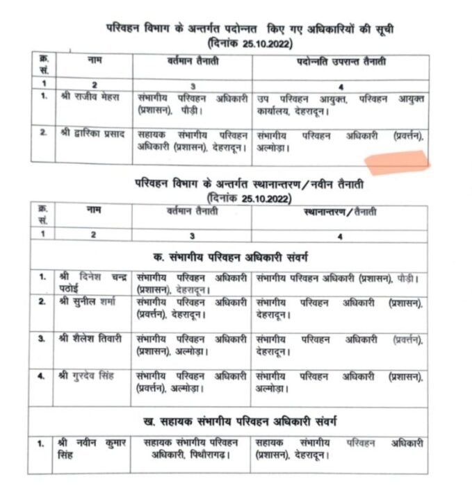 बनाया गया है इसके अलावा परिवहन विभाग के अंतर्गत कई स्थानांतरण किए गए हैं वर्तमान में दिनेश चंद्र पठोई को संभागीय परिवहन अधिकारी प्रशासन देहरादून से संभागीय परिवहन अधिकारी प्रशासन पौड़ी बनाया गया है जबकि सुनील कुमार शर्मा को संभागीय परिवहन अधिकारी प्रवर्तन देहरादून से संभागीय परिवहन अधिकारी प्रशासन देहरादून बनाया गया है इसके अलावा शैलेश तिवारी संभागीय परिवहन अधिकारी प्रशासन अल्मोड़ा को संभागीय परिवहन अधिकारी प्रवर्तन देहरादून के पद पर भेजा गया है वहीं अल्मोड़ा में तैनात गुरदेव सिंह को संभागीय परिवहन अधिकारी प्रशासन अल्मोड़ा बनाया गया है इसके अलावा सहायक संभागीय परिवहन अधिकारी पिथौरागढ़ नवीन कुमार सिंह को सहायक संभागीय परिवहन अधिकारी प्रशासन देहरादून के पद पर भेजा गया है जिनकी तैनाती कर दी गई है।