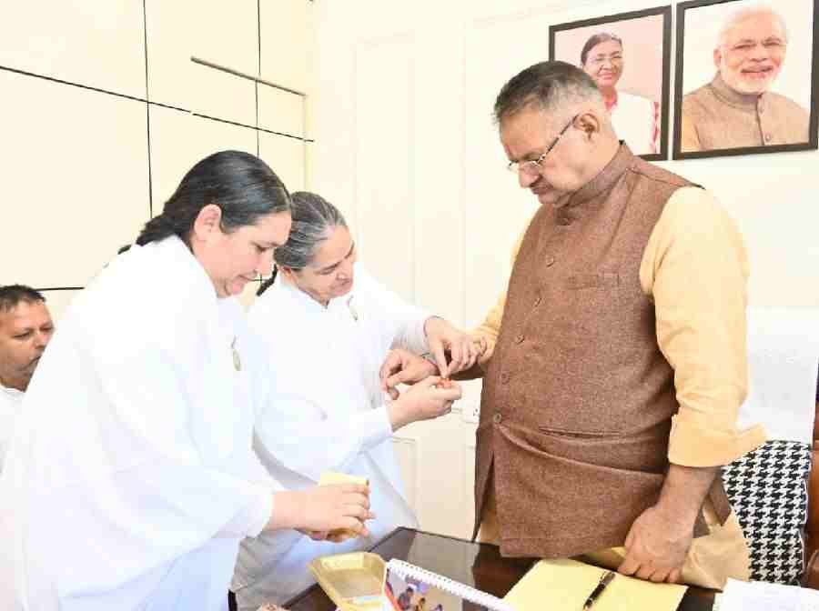 प्रदेश के कृषि मंत्री गणेश जोशी के कैंप कार्यालय में आज ब्रह्मकुमारी बहनों ने भेंट कर हर वर्ष की भांति इस वर्ष भी ब्रह्मकुमारी बहिनें मीना और शालू बहिन ने मंत्री गणेश जोशी की कलाई पर रक्षासूत्र बांधकर उनके दीर्घायु की कामना की। इस अवसर पर कैबिनेट मंत्री गणेश जोशी ने भी ब्रह्मकुमारी बहिनों को राखी के बदले उनको रक्षा का वचन और उपहार भी भेंट किया और रक्षाबंधन की अग्रिम शुभकामनाएं दी।