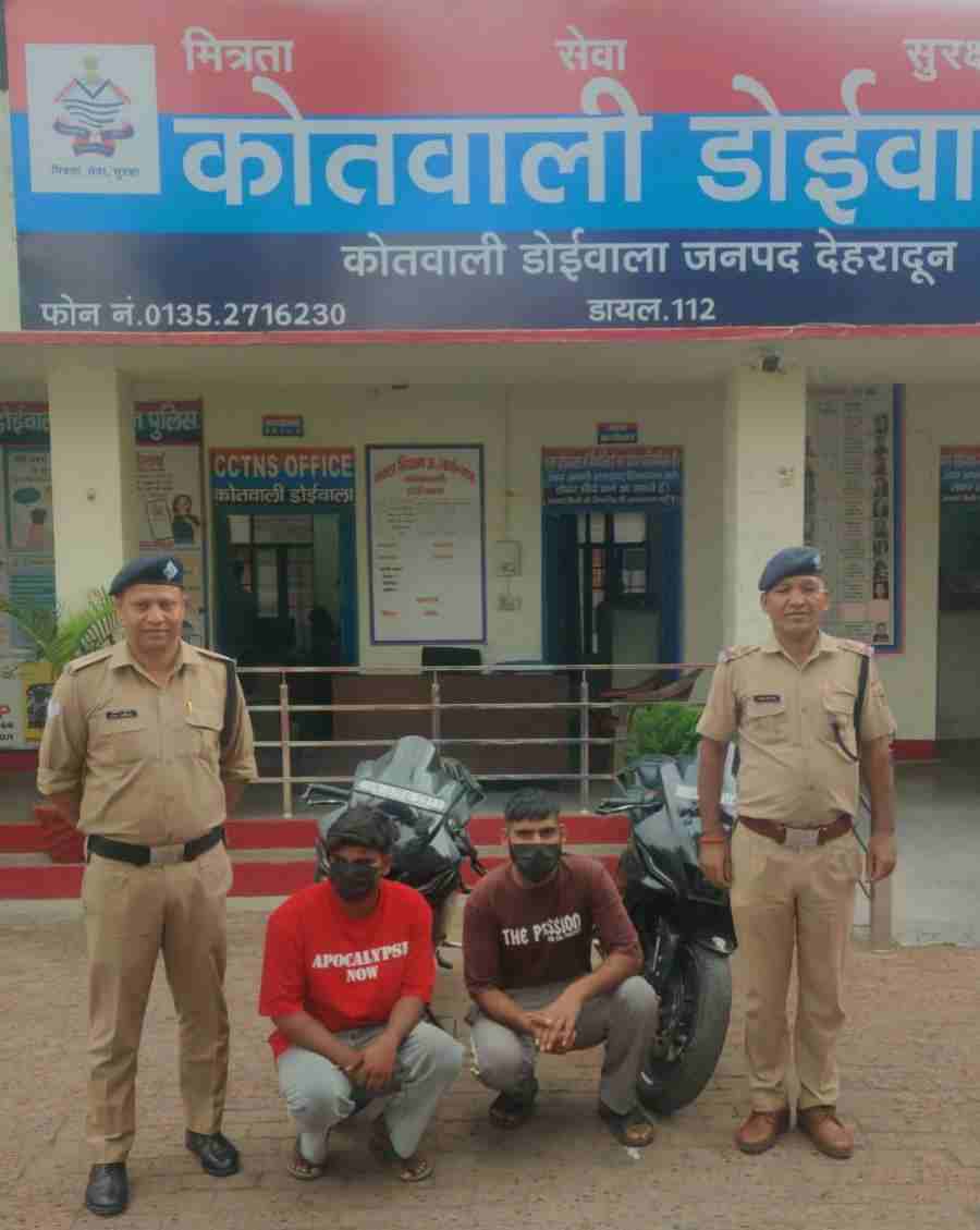 जिस पर डोईवाला पुलिस द्वारा वीडियो में दिख रही दोनो मोटर साइकिलों के सम्बन्ध में जानकारी करने पर उनका रजिस्ट्रेशन नम्बर क्रमश: यू0के0-07-एफक्यू-5911 यामाहा आर-15 व यू0के0-17-यू- 8159- यामाहा आर-15 होना ज्ञात हुआ। बाइक स्वामियों के संबंध में जानकारी करने पर उक्त दोनों बाइके सुमित पुत्र मुनेश निवासी केशवपुरी बस्ती कोतवाली डोईवाला देहरादून उम्र 21 वर्ष तथा सत्यम सैनी पुत्र यशवीर सैनी निवासी नौका दूधली रोड थाना नेहरू कॉलोनी, देहरादून, उम्र: 21 वर्ष के नाम पर रजिस्टर्ड होना प्रकाश में आया, जिस पर दिनांक 02/06/2025 को पुलिस द्वारा वीडियो मे दिख रहे उक्त दोनो वाहन चालको के विरूद्ध आवश्यक वैधानिक कार्यवाही करते हुए उन्हें थाने पर लाया गया तथा दोनो बाईको को एमवी एक्ट में सीज किया गया, साथ ही भविष्य में इस प्रकार के कार्यों की पुनरावृत्ति न करने के संबंध में सख्त चेतावनी दी गई।
