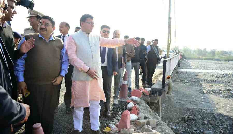 मुख्यमंत्री  पुष्कर सिंह धामी ने शुक्रवार को रायपुर क्षेत्र में माह अक्टूबर 2022 में आपदा से प्रभावित सौंग पुल, ग्राम पंचायत खैरी मानसिंह में क्षतिग्रस्त सड़कें व पुश्तों के पुनर्निर्माण कार्यों का स्थलीय निरीक्षण किया।