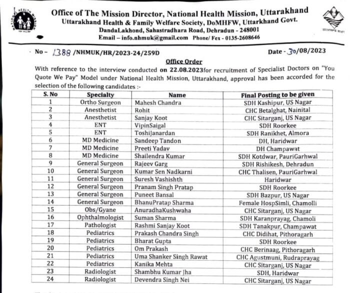 स्वास्थ्य विभाग लम्बे समय से राज्य के पर्वतीय जिलों में स्पेशलिस्ट और सुपर स्पेशलिस्ट डाक्टरों की कमी को दूर करने की कवायद कर रहा है। जिसके पहले चरण में 24 डॉक्टरों का चयन किया गया है। इनमें पैथोलॉजिस्ट, गायनोलॉजिस्ट, एनेस्थेटिक, सर्जन, पीडियाट्रिश, ऑर्थाेपेडिक डॉक्टरों को तैनाती दी गई है। राष्ट्रीय स्वास्थ्य मिशन की लोकप्रिय योजना ‘यू कोट-वी पे’ के माध्यम से स्पेशलिस्ट डॉक्टरों की संविदा पर तैनाती की गई है। सभी डॉक्टरों को तैनाती के ऑडर जारी कर दिए गए हैं।